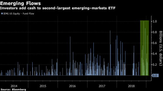 Meanwhile, assets inside the iShares Core MSCI Emerging Markets ETF — our planet’s second-largest emerging-markets strategy — have soared a great all-time high of $54 billion. The fund has absorbed close to $2.5 billion this month, fuelled by one investor making several massive trades a week ago.