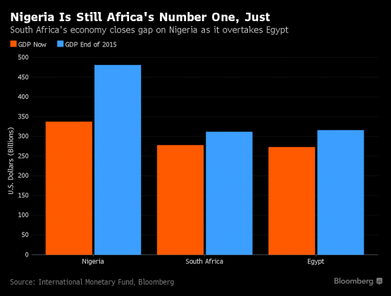 Nigeria is still Africa’s top economy, even after a 30% devaluation on the naira last month knocked almost $150 billion off its gross domestic product when measured in dollar terms. South Africa, who has regained second place after overtaking Egypt, is closing the gap. While its economy also shrank because rand weakened, the gap with Nigeria has narrowed to $60 billion now from $170 billion after 2015.