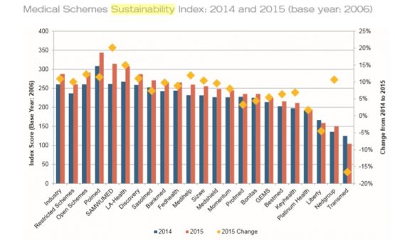 Alexander Forbes Health developed a Medical Schemes Sustainability Index to determine the financial sustainability of the medical scheme. The most up-to-date index shows Polmed, Samwumed, LA Health, Discovery Health Medical Scheme (DHMS) and Sasolmed as being the most sustainable in the industry.?