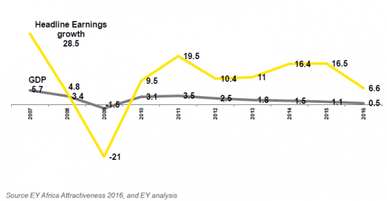 Based when using annual economic growth estimate of 0.6%, the firm saw that South African banks earnings were 11x greater than estimated GDP growth. New data from Statistics Africa, released after EY presented its findings, reveals that the economy grew by 0.3% in 2016, down from 1.3% previously. Reported by EY, each 1% increase in GDP results a 5% boost in headline earnings.