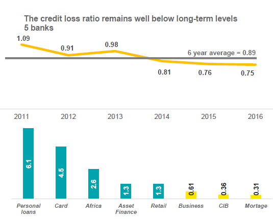 Among the factors that weighed on domestic banks in 2016 were multi-year low growth rates in one payemnt advances and assets. Asset growth through the bank’s rest of Africa operations turned negative the very first time in over 19 years, falling by 10.8% to R265 million.