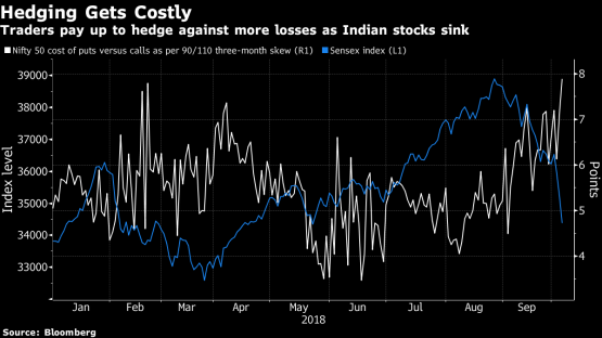 As the S&P BSE Sensex Index sank in a correction Friday, posting its biggest weekly plunge in many than couple of years, investors began paying up to hedge against more declines. The expense of bearish NSE Nifty 50 Index options jumped to the highest level since August of recently in accordance with the expense of bullish contracts, data compiled by Bloomberg show.